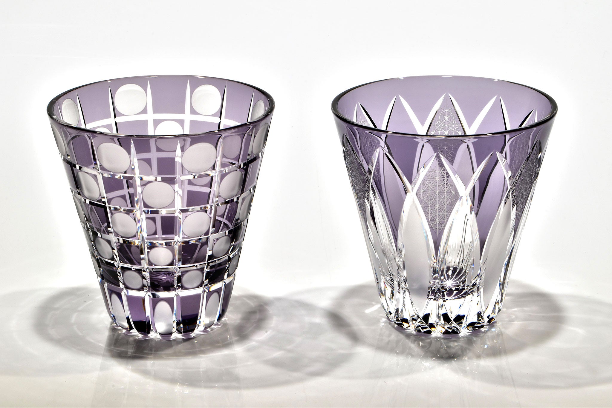 制作の現場では、完成形を定めすぎず、その瞬間の判断と感性に身を委ねる即興的な切子のスタイルを確立。機械的な再現では決して生まれない線やリズムは、一作ごとに異なる生命力を宿し、二度と同じものが生まれない「一期一会」の輝きを放ちます。