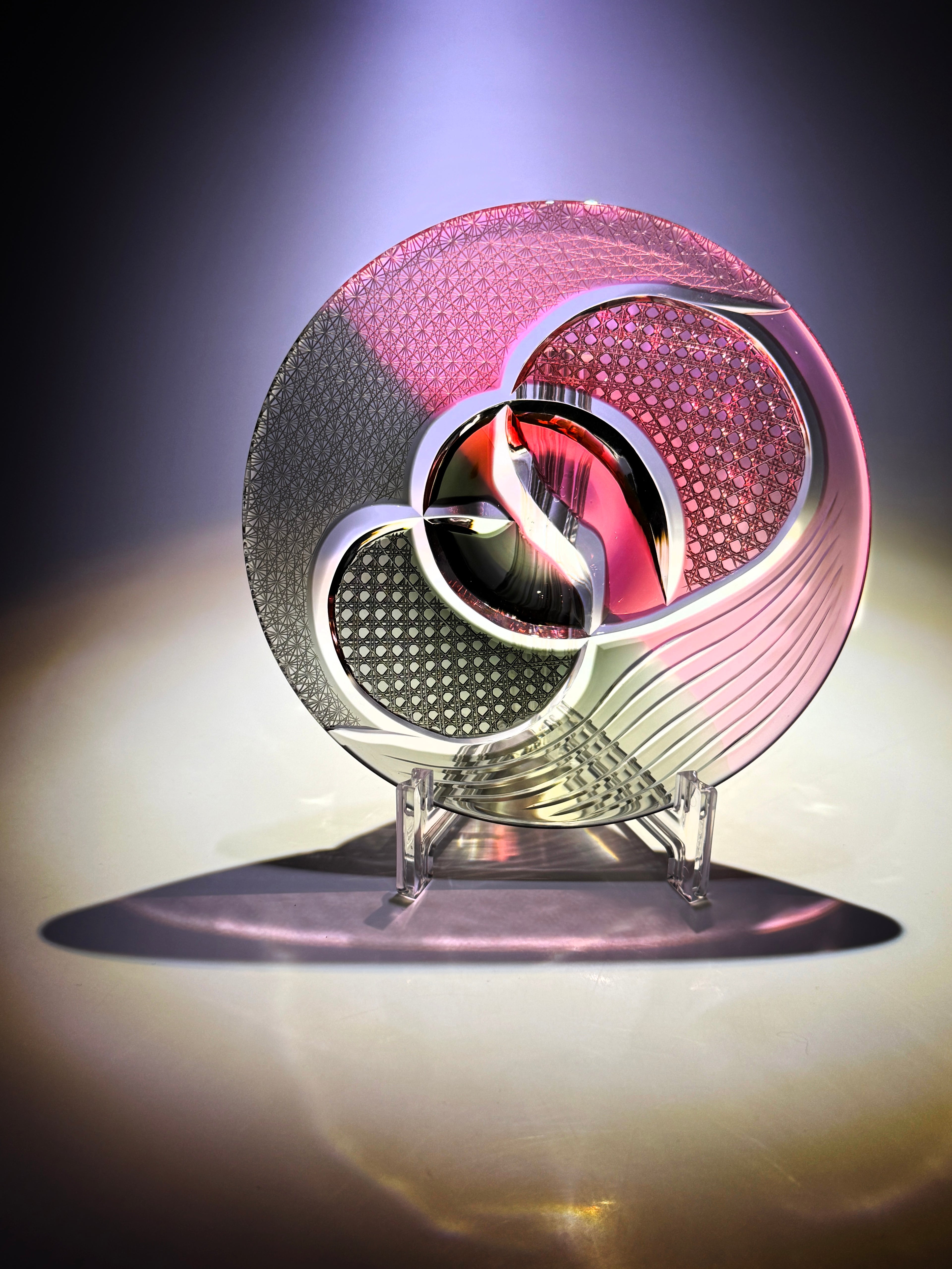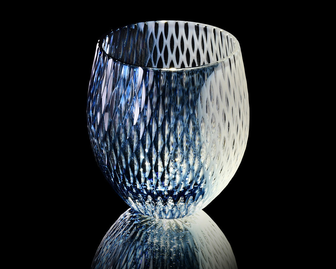 華硝の中でも最高度の技術を持つ二代目 熊倉隆一の作品には、その時々の発想や感性に基づいた即興性に溢れるデザインが多くみられます。その作品は、高度な技術に裏打ちされた繊細さと大胆さが特徴となっており、これまでも、ルーブル美術館での展示や洞爺湖サミットにおける国賓への贈呈品としての選出など国内外問わず高い評価をいただいてきました。その功績が認められ、令和6年 春の叙勲において「旭日単光章」を受賞いたしました。